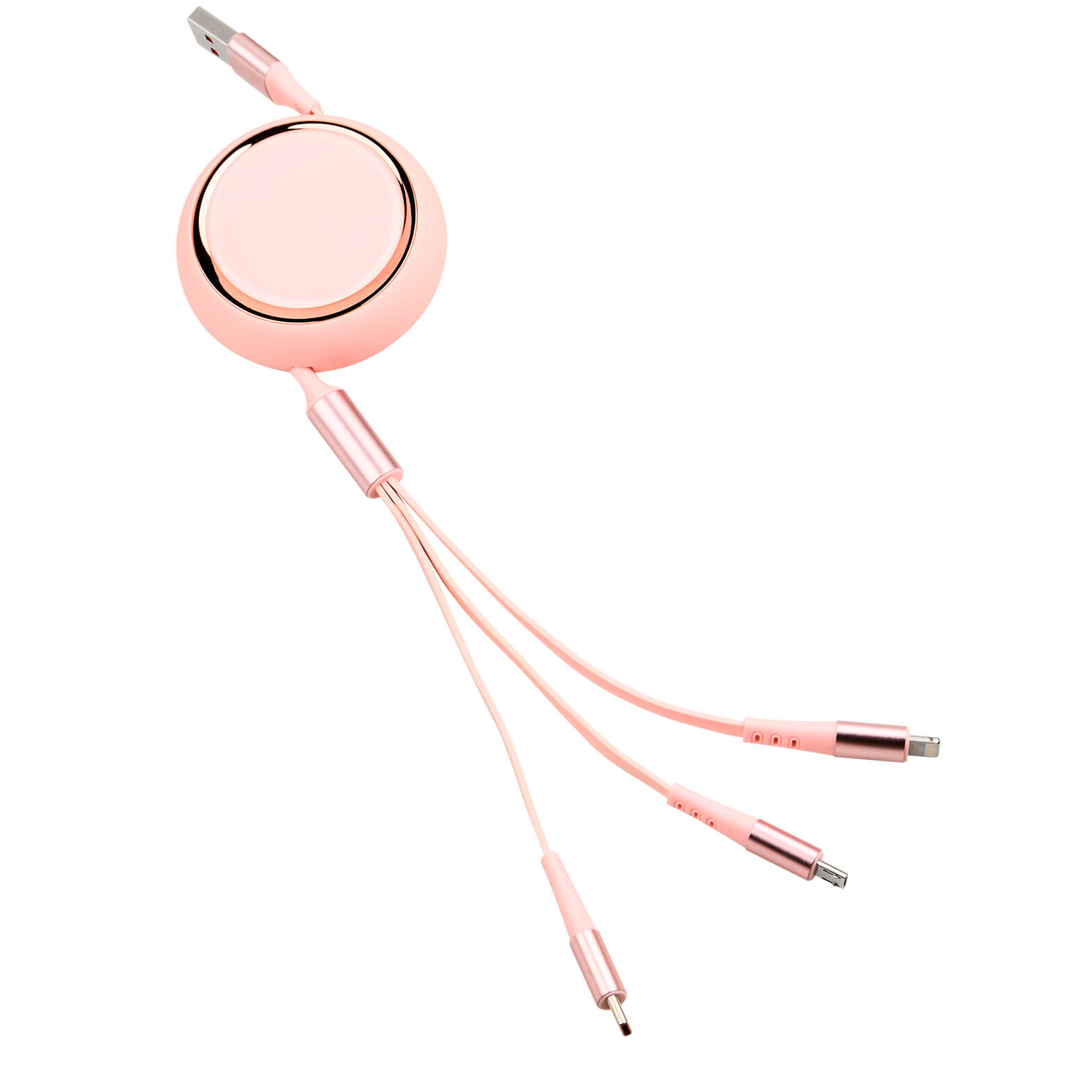 Cargador multifuncional extensible circular (115 mts.) con acabado rubber. Cuenta con entrada USB y conectores de salida micro USB, tipo C y Lightning.