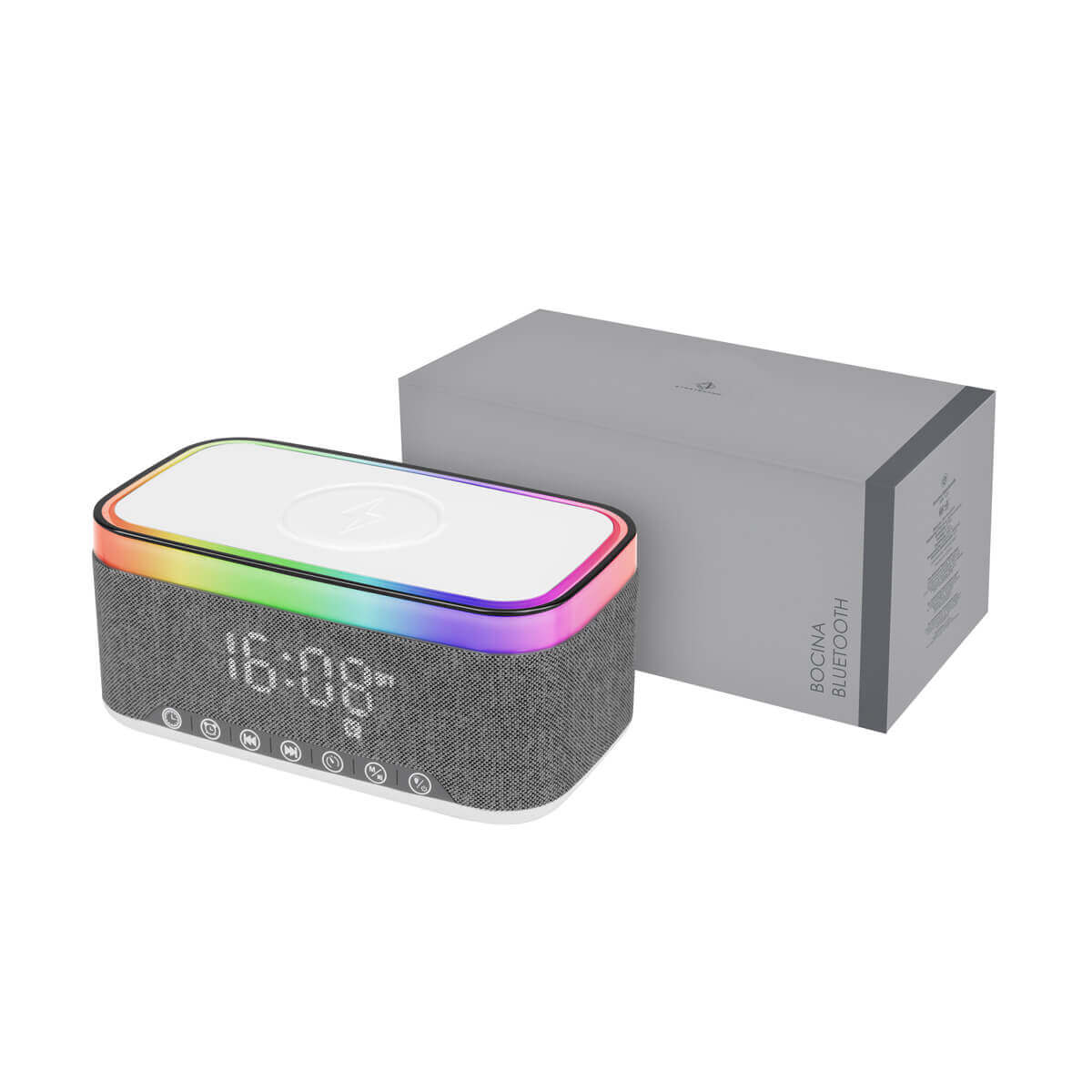 Reloj despertador multifuncional. Integra una bocina con tecnología Bluetooth 5.3, cargador inalámbrico de 15 W e iluminación ambiental con 6 modos de luz. El reloj digital ofrece 3 niveles de brillo (bajo, medio y alto). Cuenta con base antideslizante para evitar movimientos no deseados. Incluye cable de carga tipo C y caja individual. – MK 121