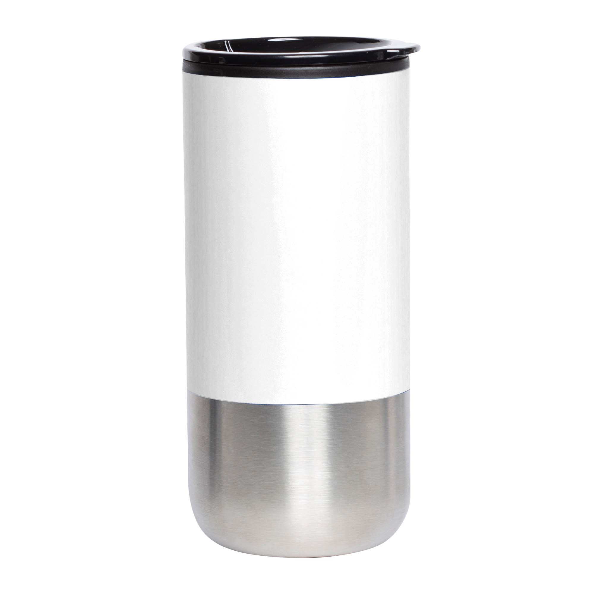 Termo de doble pared con interior de plástico y base exterior de acero inoxidable, cuenta con tapa de plástico y válvula de seguridad.