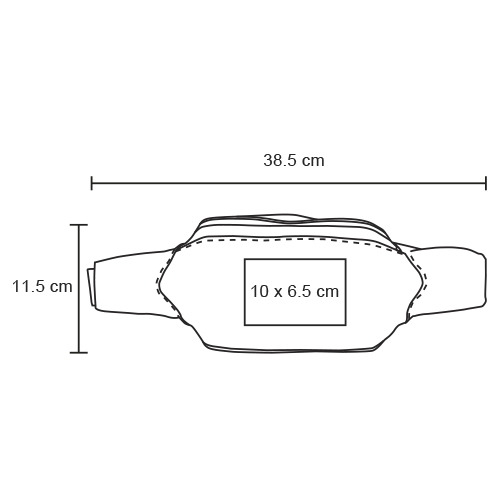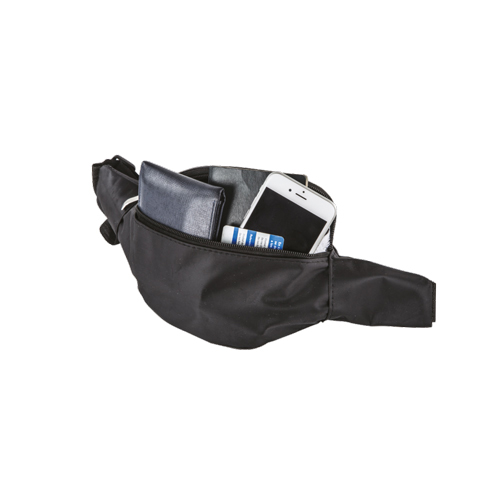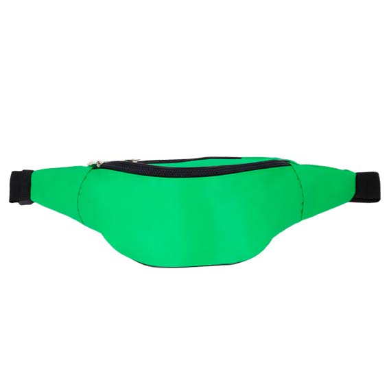 Cangurera de poliéster con dos compartimentos, cinta ajustable a la cintura y seguro de presión.
