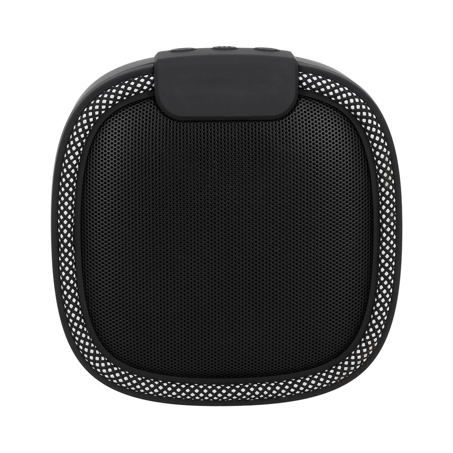 Bocina bluetooth portátil acabado rubber con radio FM, correa sujetadora y cable de carga tipo C.