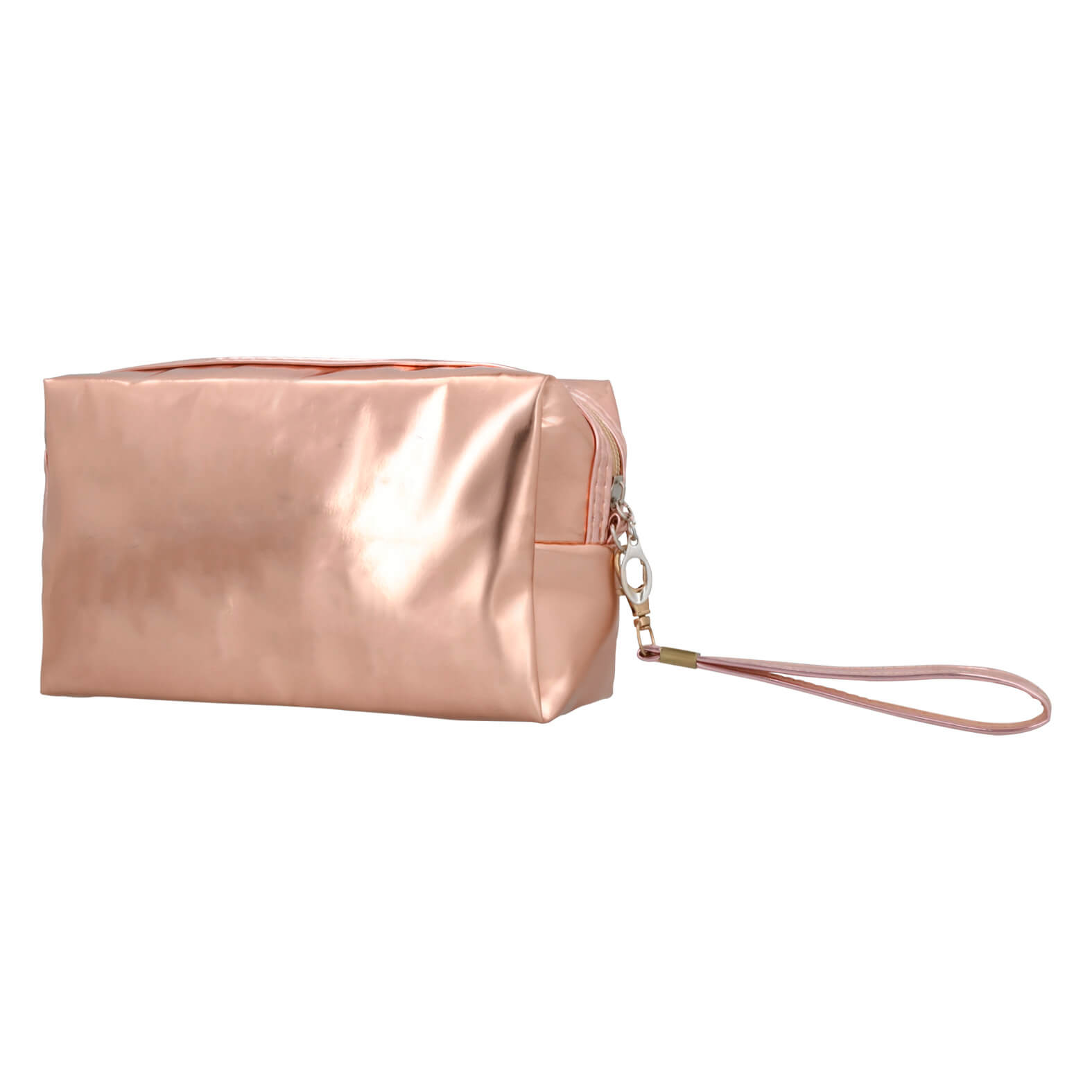 Cosmetiquera de PVC con acabado metálico, cierre, correa intercambiable y fuelle.