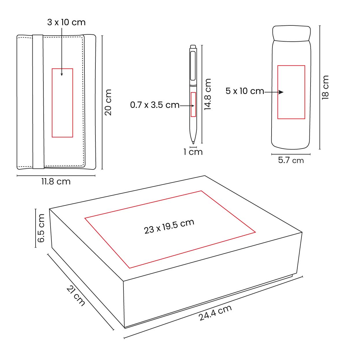 23 x 19.5 cm Caja / 3 x 10 cm Libreta / 0.7 x 3.5 cm Bolígrafo / 5 x 10 cm Termo