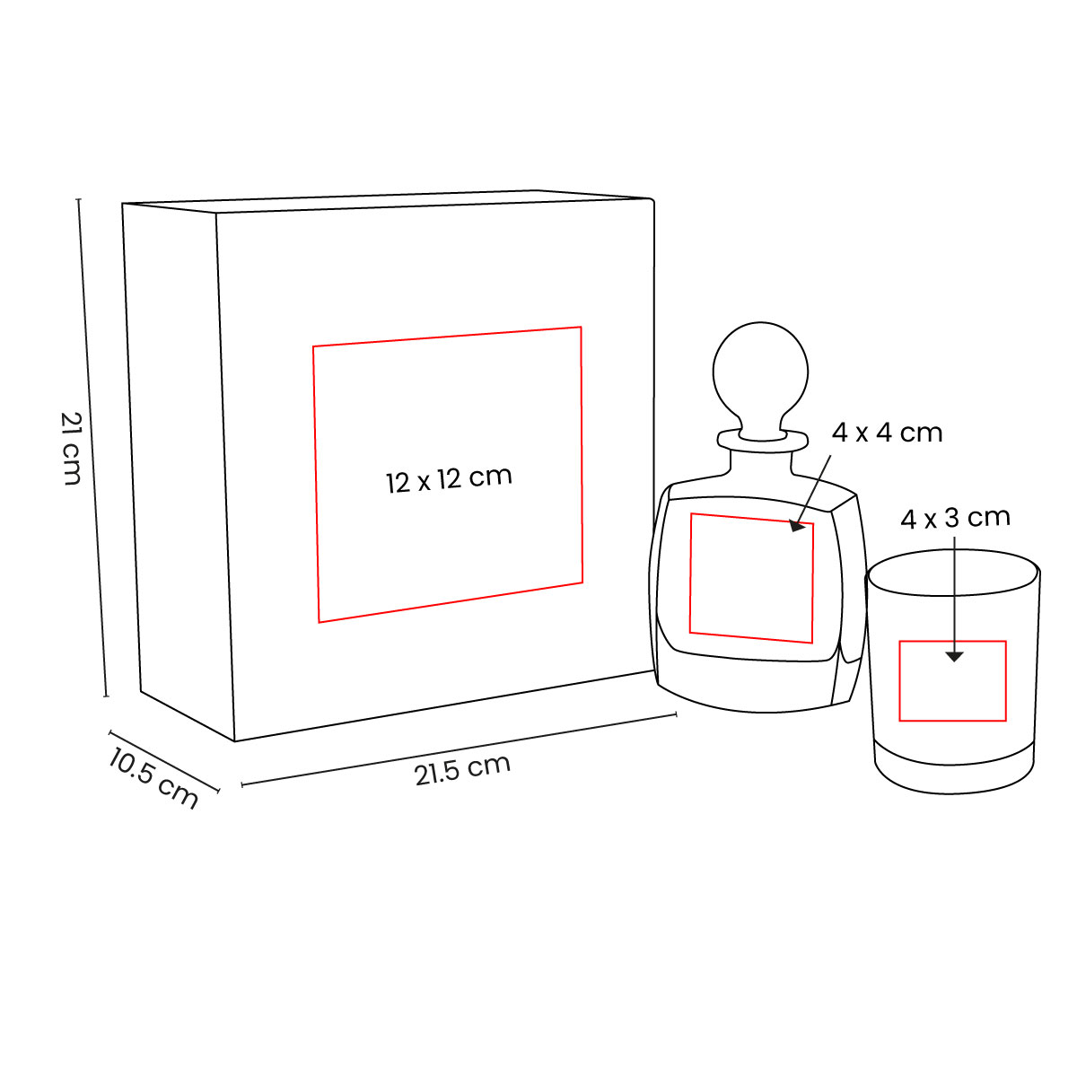 | Área de Impresión | 4 x 4 cm Licorera / 4 x 3 cm Vaso / 12 x 12 cm Caja |