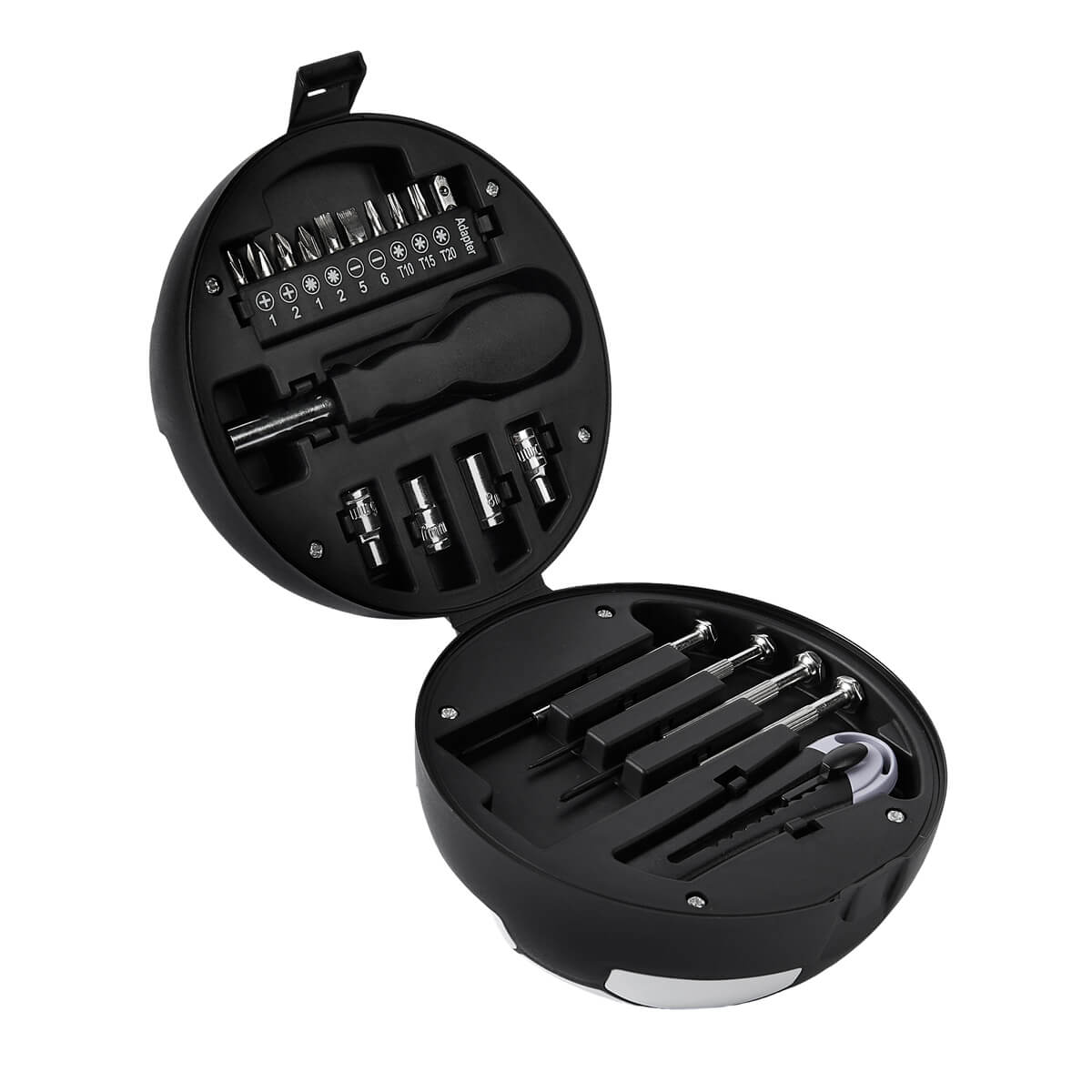 Set de herramientas con diseño de balón de fútbol soccer. Contiene 4 desarmadores relojeros con 4 puntas distintas, desarmador con 10 puntas diferentes e intercambiables, 4 dados y cúter. Estuche de plástico en forma de balón. Incluye caja individual. – SOC 429