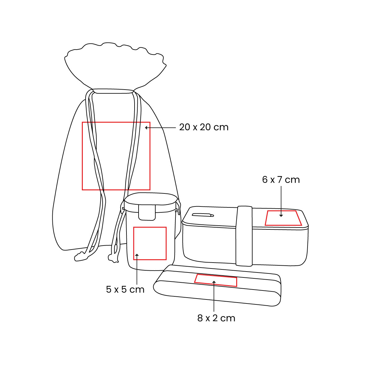 20 x 20 cm Bolsa / 6 x 7 cm Lonchera / 5 x 5 cm Contenedor / 8 x 2 cm Cubiertos