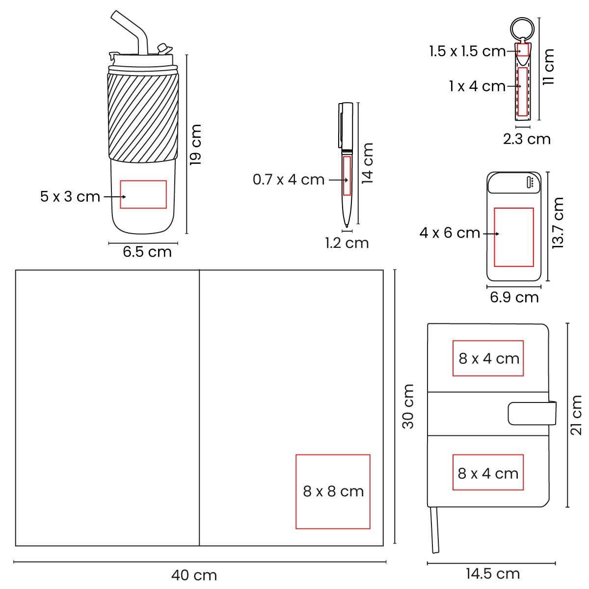 8 x 8 cm Caja / 6 x 2 Arriba / 6 x 5 cm Abajo Termo / 8 x 2.7 cm Libreta / 0.7 x 4 cm Bolígrafo / 4 x 6 cm Power Bank / 1 x 4 cm Curpiel / 1.5 x 1.5 cm Metal Llavero