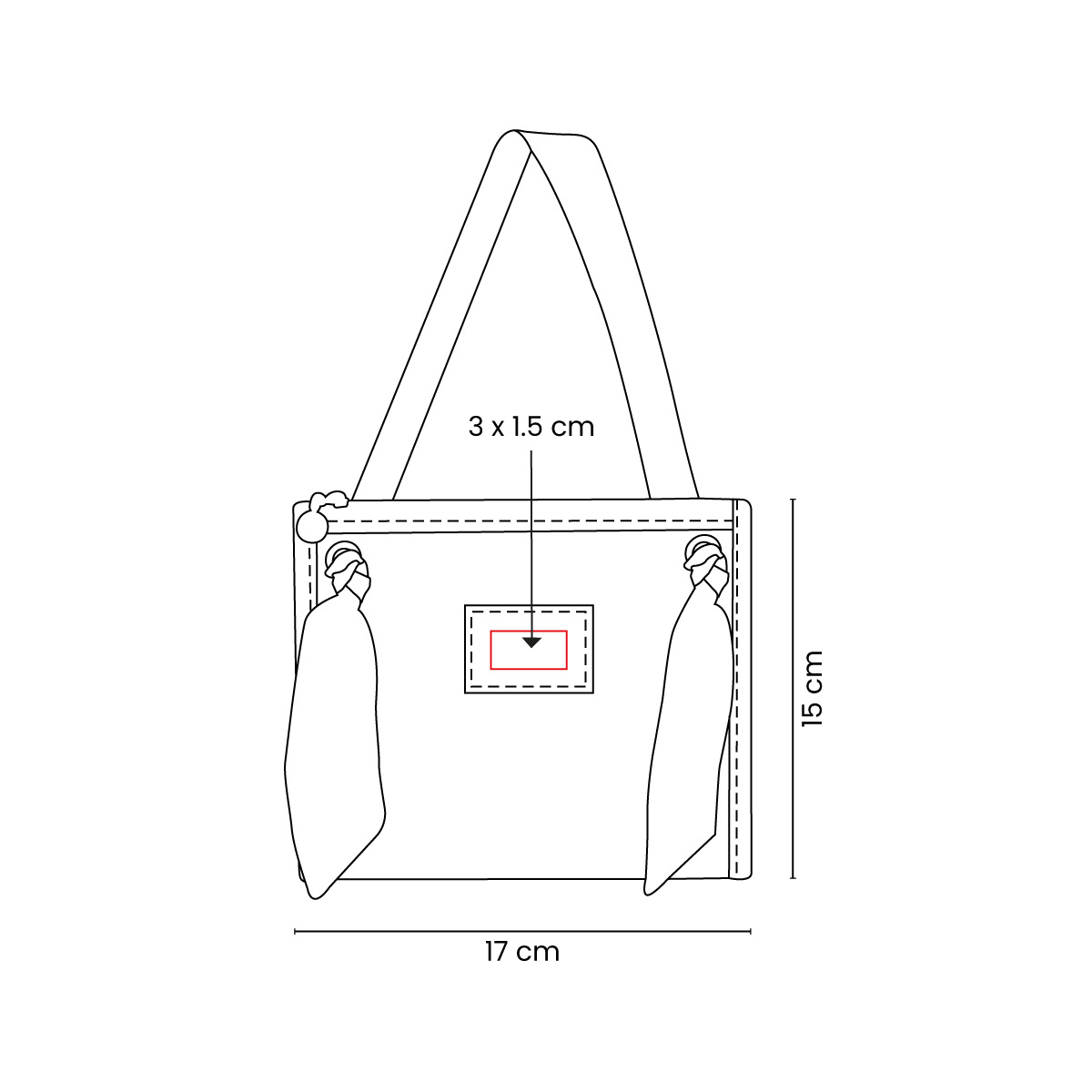 17 x 15 x 5.5 cm Bolsa / 26 x 8.5 cm Banda / 8.3 x 10 cm Cepillo / 6.5 x 10 cm Esponja