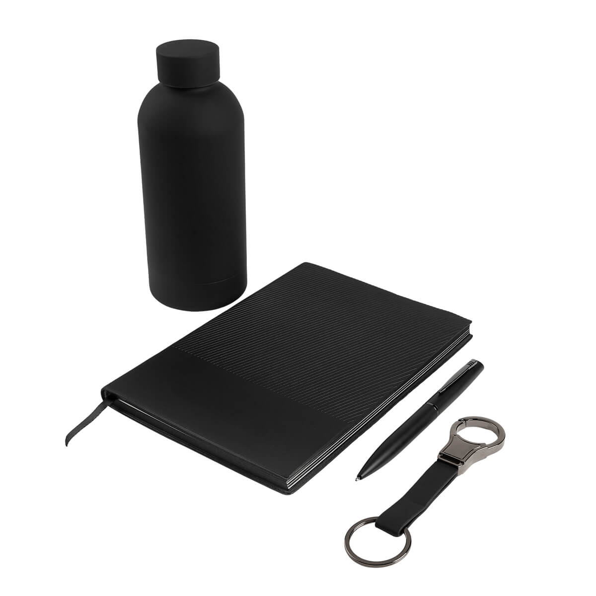 Set de regalo corporativo de 4 piezas. Incluye libreta de pasta blanda con 96 hojas a raya y listón separador, bolígrafo metálico con sistema twist, llavero de doble aro metálico con cinta de curpiel y termo de acero inoxidable de doble pared cerrado al vacío, terminado rubber que lo hace suave al tacto. Incluye caja rígida de regalo. – SET 028