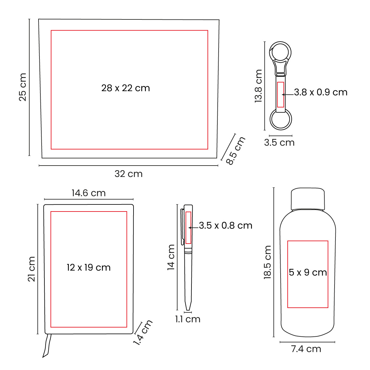 32 x 25 x 8.5 cm Caja / 14.6 x 21 x 1.4 cm Libreta / 1.1 x 14 x 1.6 cm Bolígrafo / 3.5 x 13.8 cm Llavero / 7.4 x 18.5 x 7.4 cm Termo