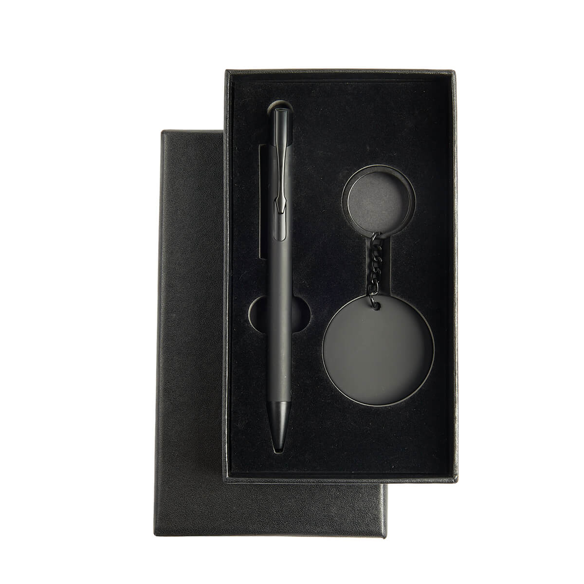 Set de regalo de 2 piezas. Contiene bolígrafo metálico con terminado rubber y mecanismo pulsador, además de un llavero metálico con terminado suave al tacto, que al grabarlo con láser, revela un efecto espejo que lo hace único y distintivo. Incluye caja de regalo. – SET 030
