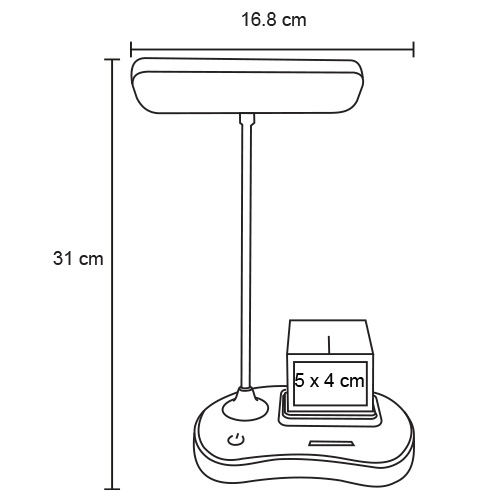 Lámpara para escritorio con multi organizador, luz cálida y blanca, soporte para celular y potencia de 4w. Incluye cable para conexión.