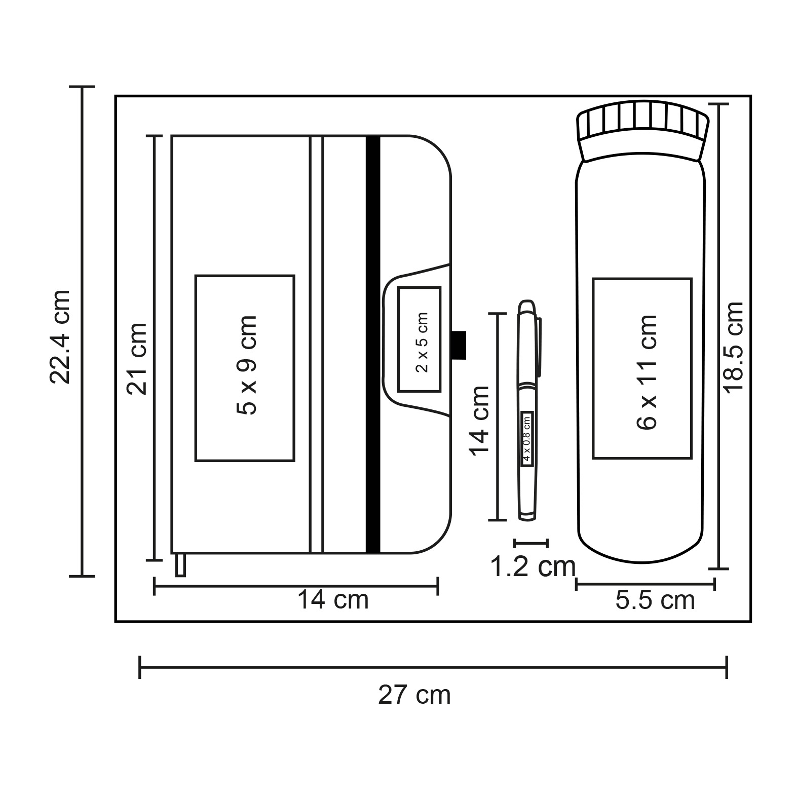 Set ejecutivo incluye: libreta de poliuretano con portada que sirve como soporte de celular, bolígrafo y termo con acabado rubber de 300 ml.