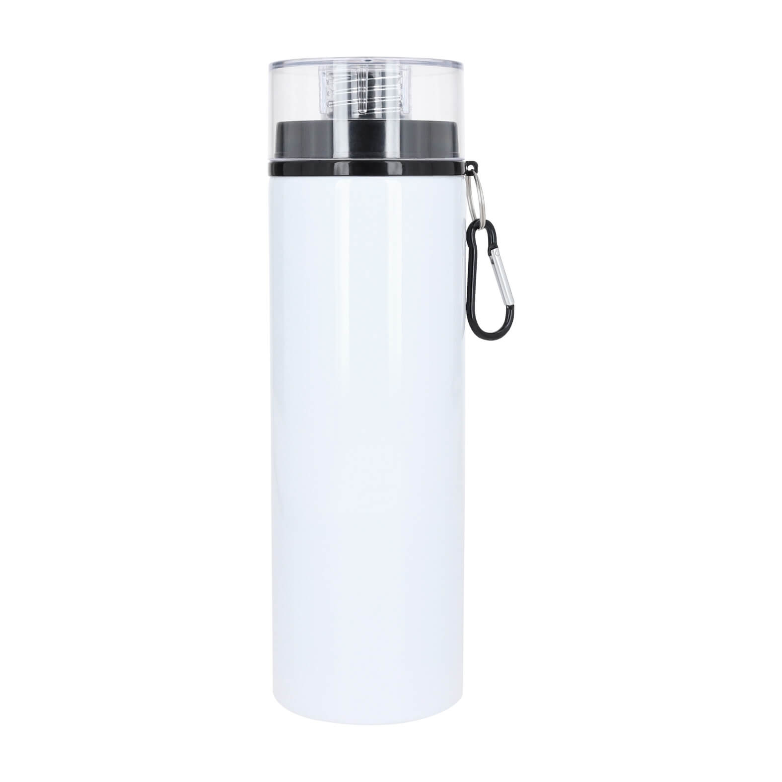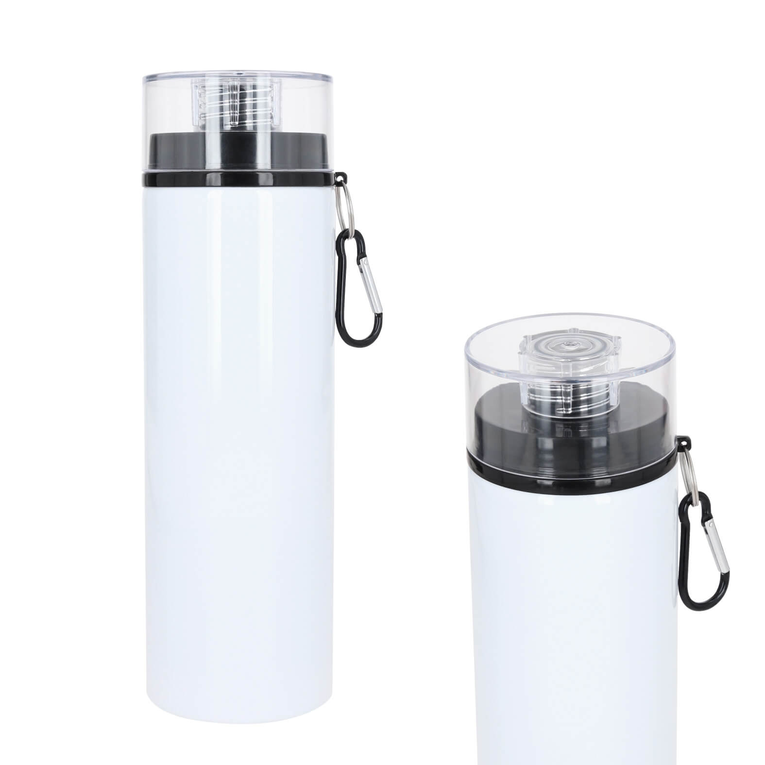 Cilindro de acero inoxidable sublimable con boquilla y tapa enroscable. Incluye gancho metálico.