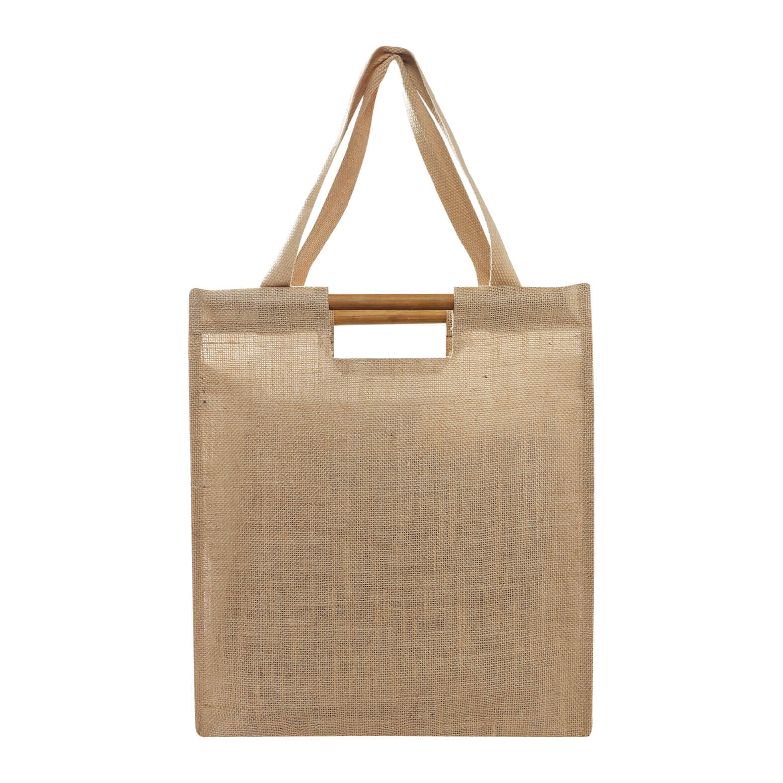 Bolsa de yute laminado con asas de bambú y asas de tela.