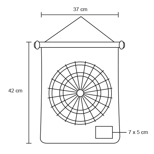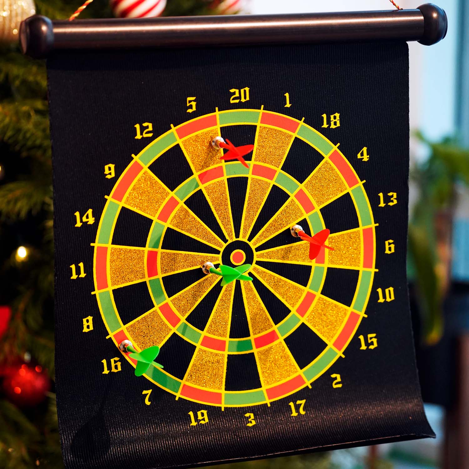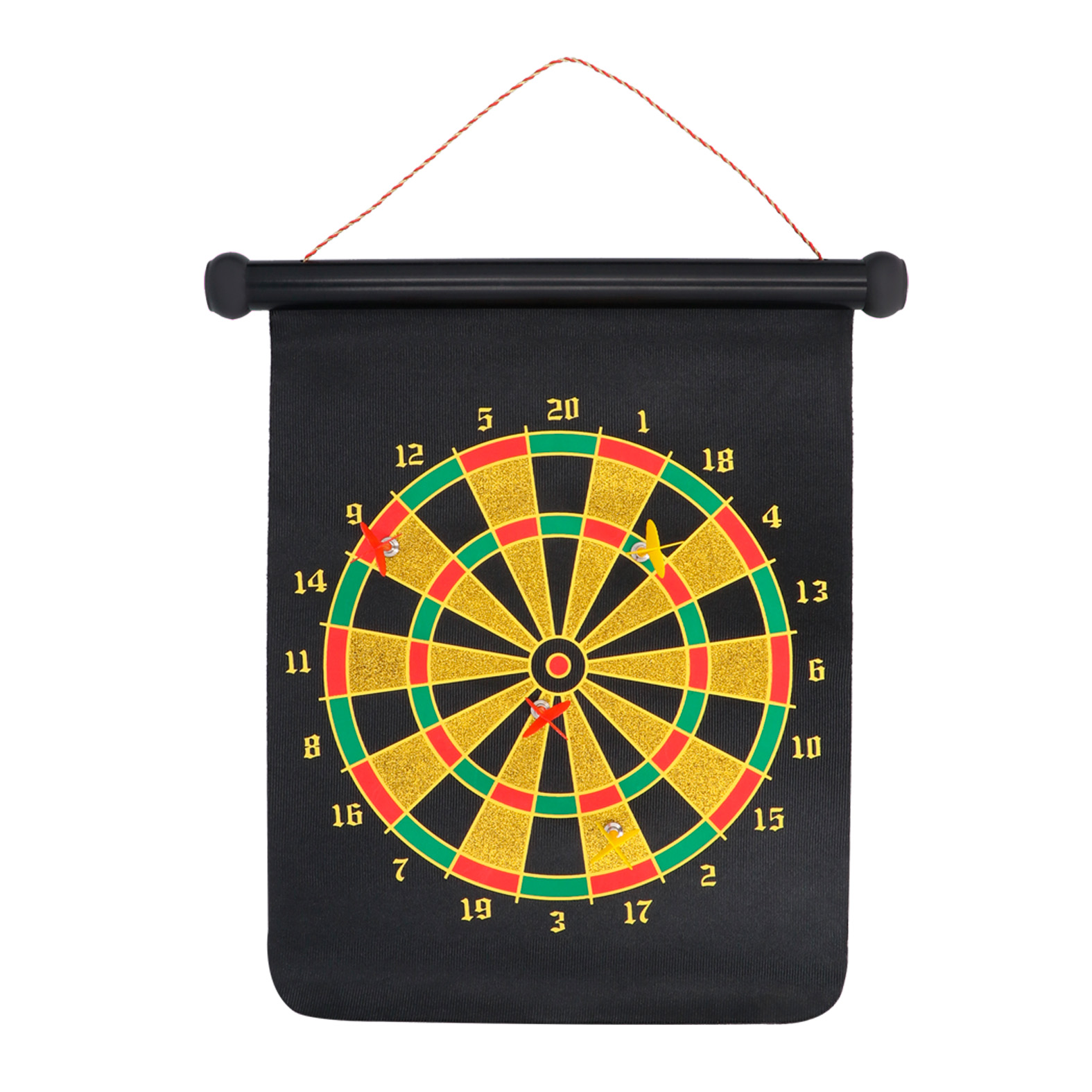 Juego de dardos magnéticos con telón de poliéster enrollable y asa para colgar. Incluye 4 dardos, tablero magnético con diversos blancos y estuche cilíndrico de cartón.