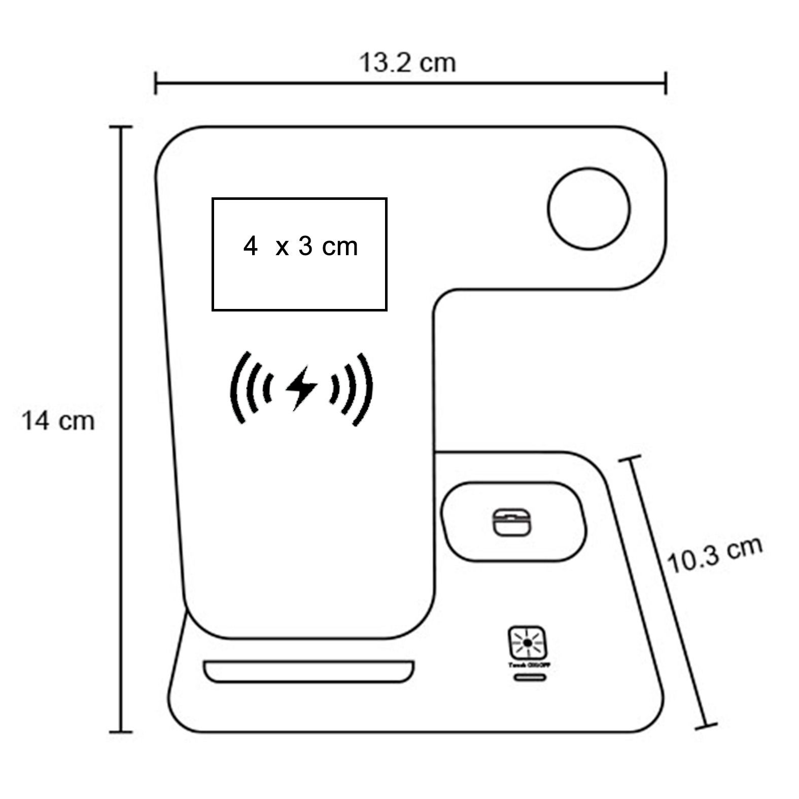 Multicargador inalámbrico para smartphone, audífonos inalámbricos, reloj inteligente y lámpara en la base, 4 en 1. Incluye cable con conector tipo C. (Compatible para dispositivos con tecnología Qi).