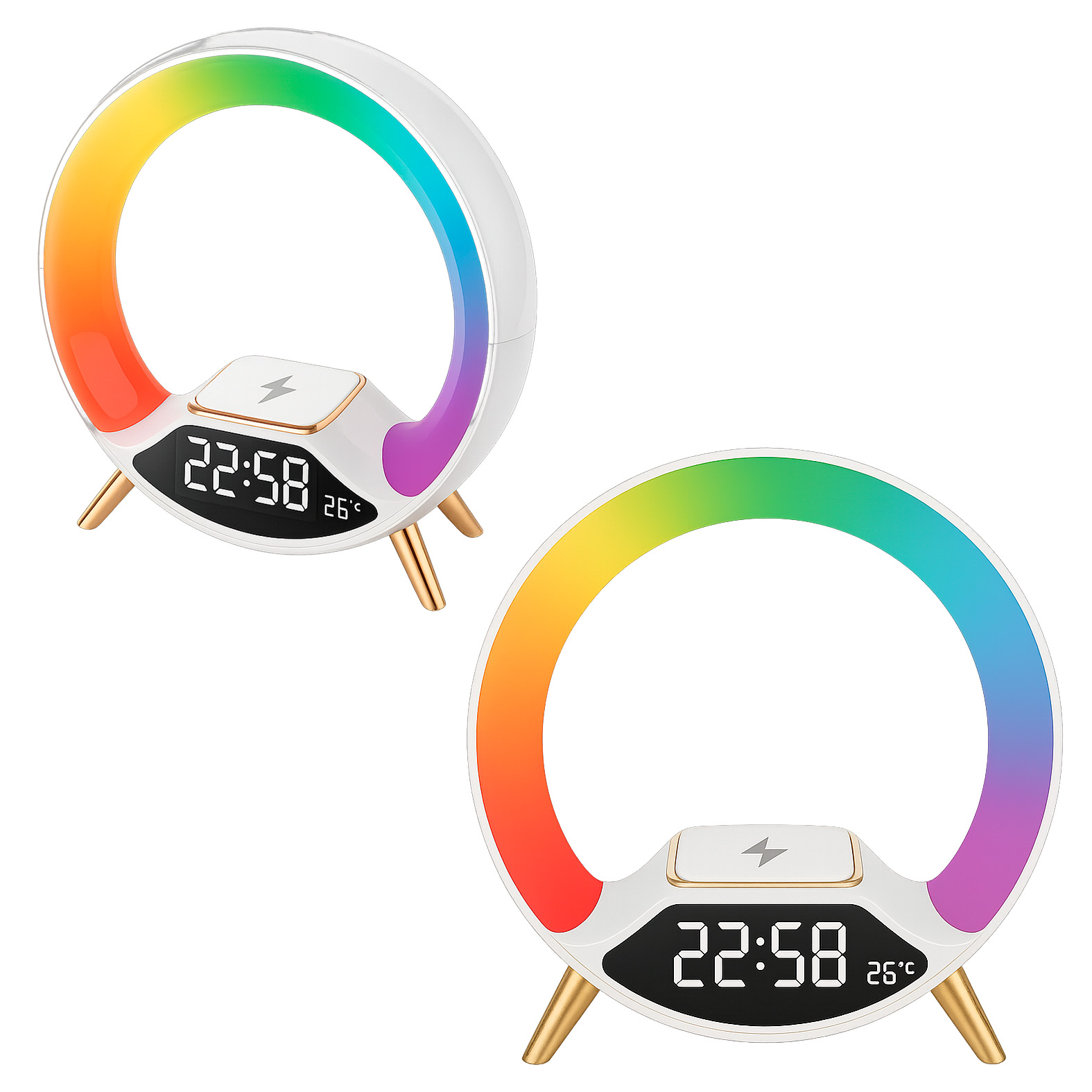 Bocina con bluetooth con luz de 7 colores y cargador wireless de 15 W. Compatible con smartphones con tecnología Qi, incluye cable de carga.