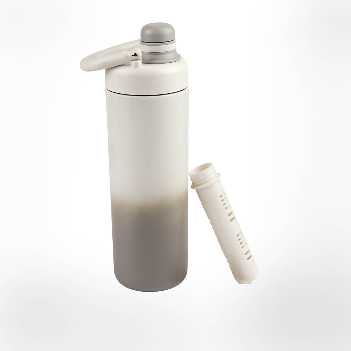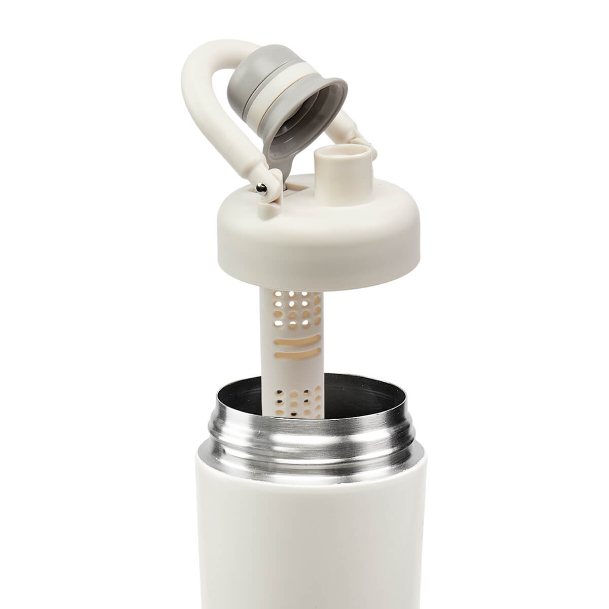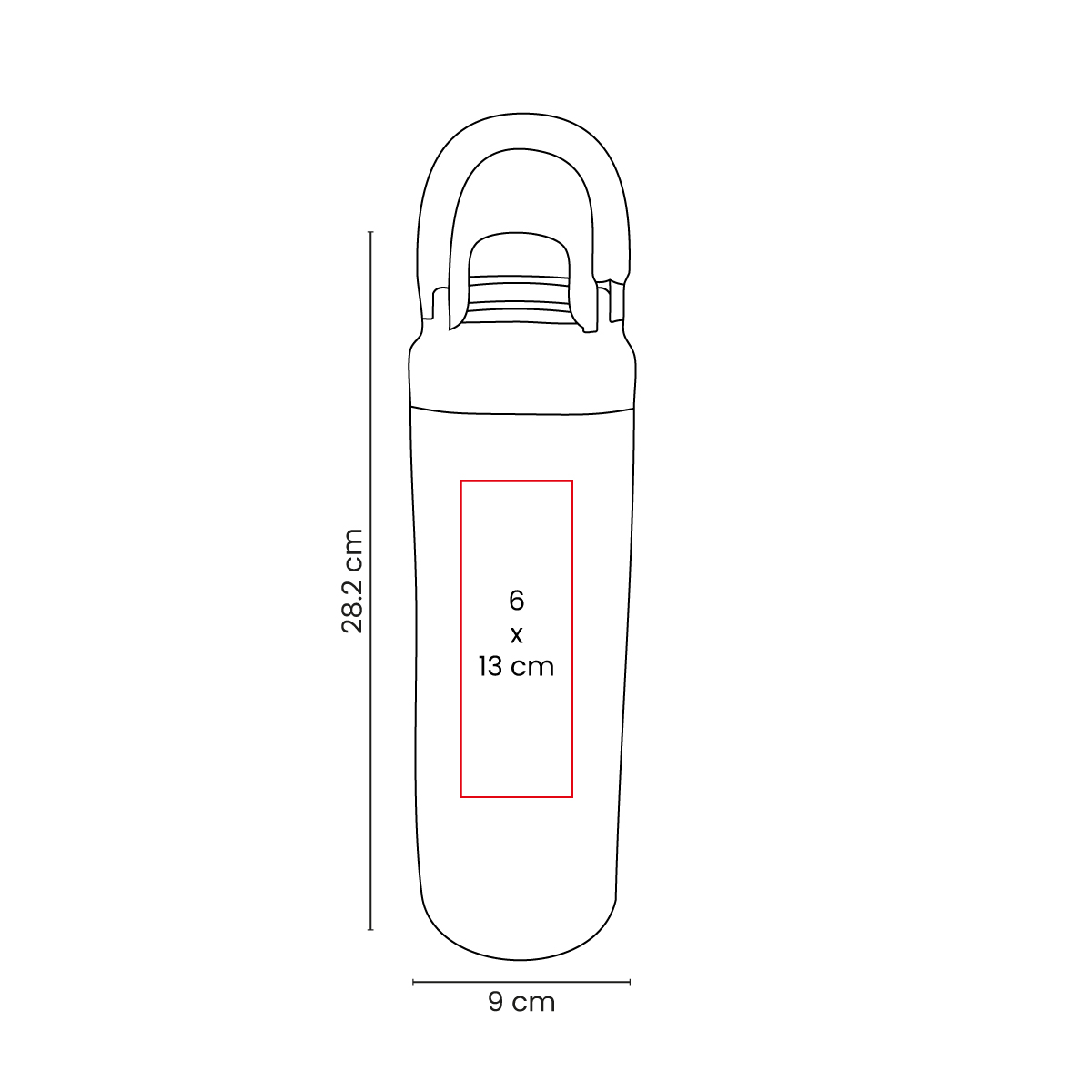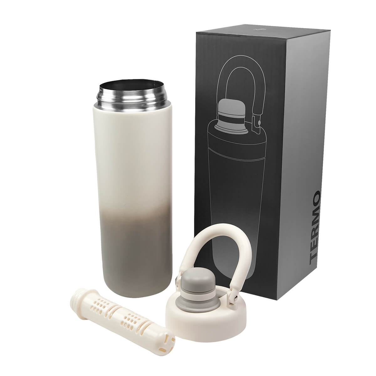 Termo doble pared. Cerrado al vacío. Pared interna y externa de acero inoxidable. Terminado en texturizado rugoso, que facilita su agarre. Incluye tapa de plástico con sistema de rosca, sobre tapa con boquilla y filtro interno para infusiones o tisanas. Su diseño elegante y minimalista se complementa con un asa ergonómica que facilita el transporte, ideal para transportarlo a donde quiera que vayas. El termo está pintado a mano, por lo tanto el color y degradado pueden variar en todos los modelos. Mantiene tus bebidas calientes por 6 hrs y frías hasta 12 hrs. Capacidad de 27 Oz. Incluye caja individual. – TMPS 265