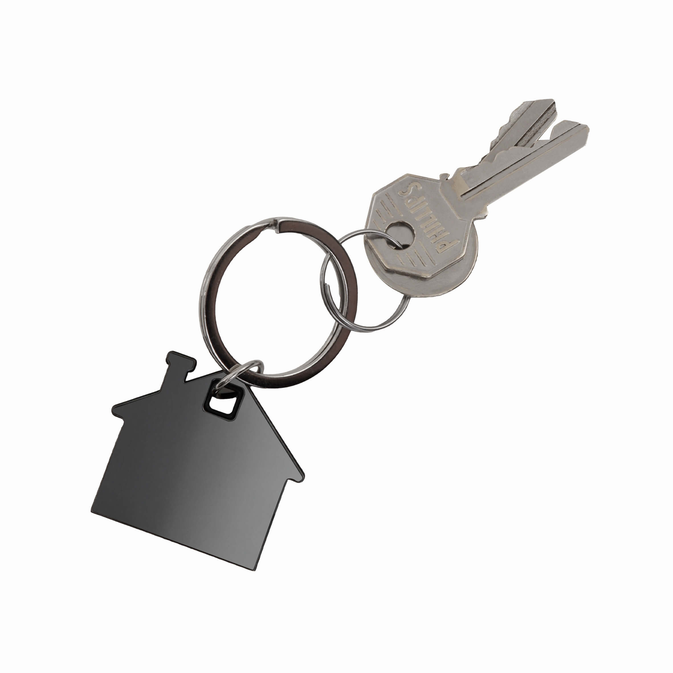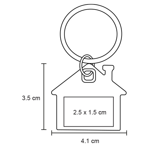 Llavero metálico con diseño en forma de casa y acabado espejo.