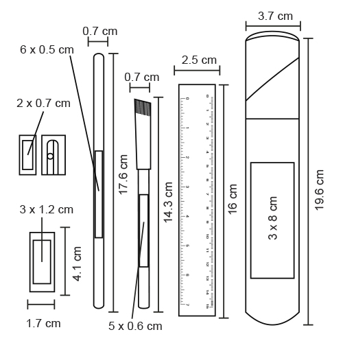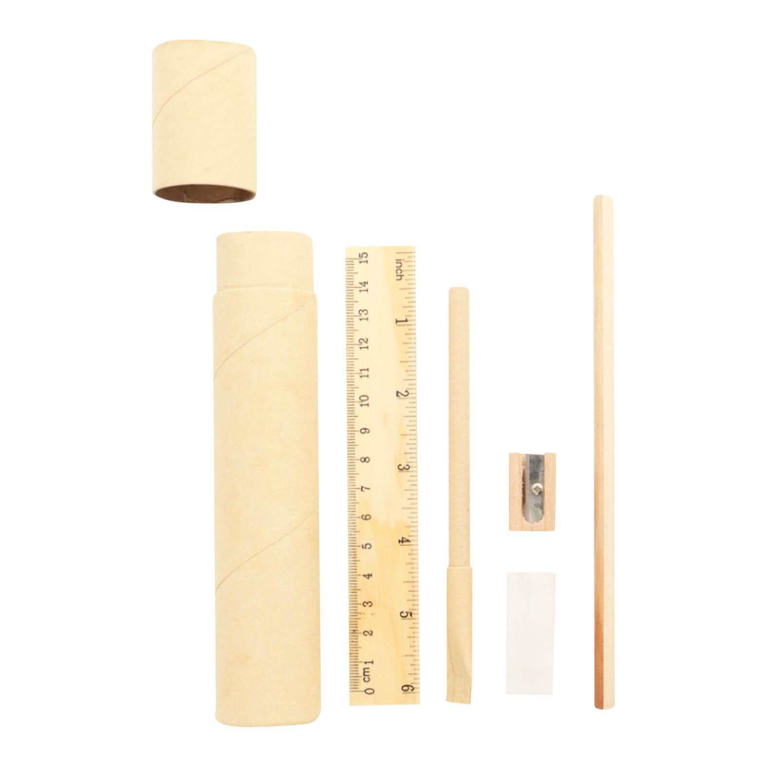 Juego escolar de cartón que incluye 1 lápiz, 1 bolígrafo, 1 sacapuntas, 1 goma y 1 regla de 15 cm.