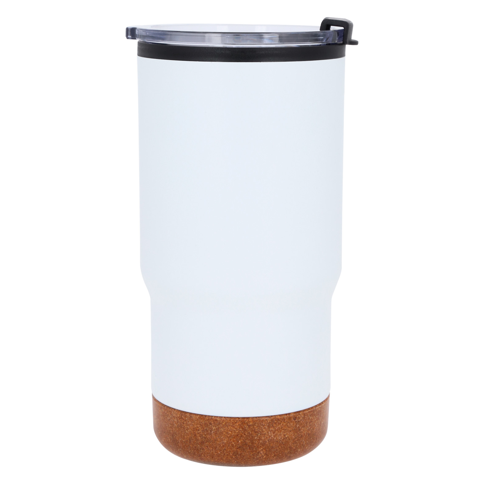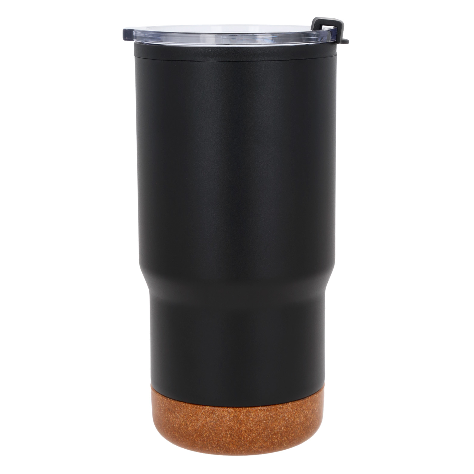 Termo de doble pared con acabado rugoso, exterior de acero inoxidable e interior de plástico, base de corcho y tapa de cierre a presión.