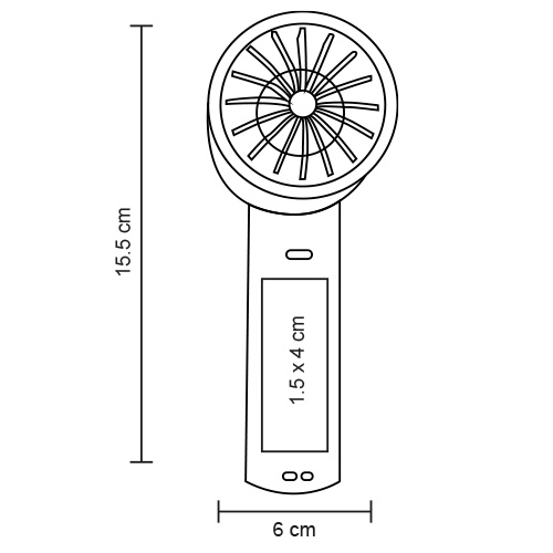 Ventilador portátil con mango de plástico y diseño minimalista. Cuenta con botón de encendido/apagado, 3 velocidades y puerto de carga tipo C.
