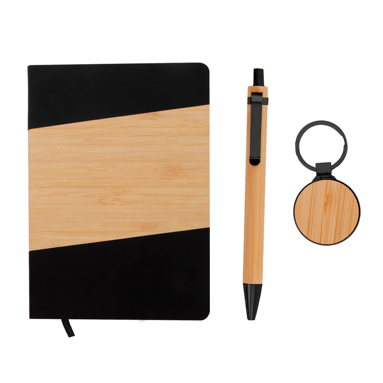Set ejecutivo incluye: llavero metálico con detalle en bambú, bolígrafo de bambú, libreta y caja de regalo.