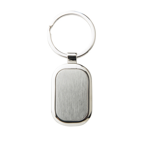 Llavero con placa metálica central, esquinas redondeadas y aro reforzado.